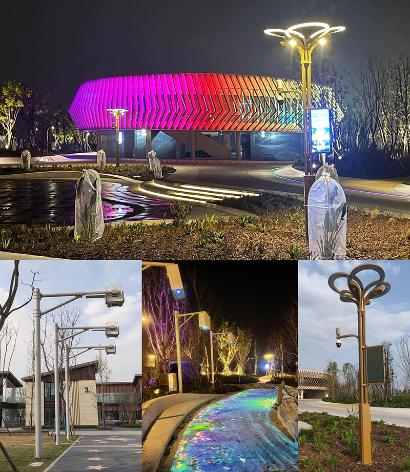 ”智慧城市,智慧照明“在项目中亦多处使用,功能照明上,各地块均使用非标定制的智慧灯杆,实现园区监控、信息投播、语音广播、功能照明、WiFi传播、一键报警等一体化智慧科技,智能城市系统化。