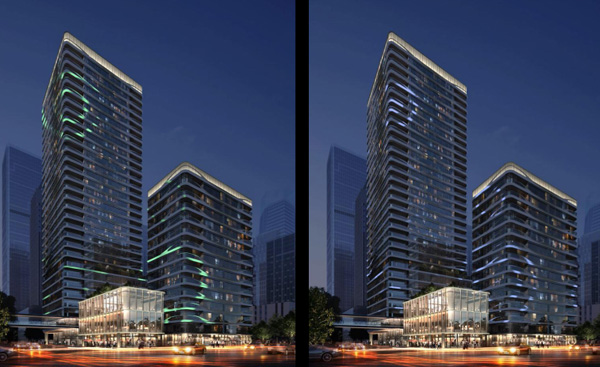 项目建筑与幕墙结构以流畅线条与叠加元素为核心设计语言,既赋予建筑向上生长的蓬勃张力与丰富的空间层次感,又以灵动曲线勾勒出轻盈飘逸的动态美感。为呼应这一独特的建筑风格,我们的设计师们以灯光为创意画笔,沿建筑结构逐层铺陈光亮,让夜幕中的建筑呈现出层层递进、叠加累积的灯光韵律。